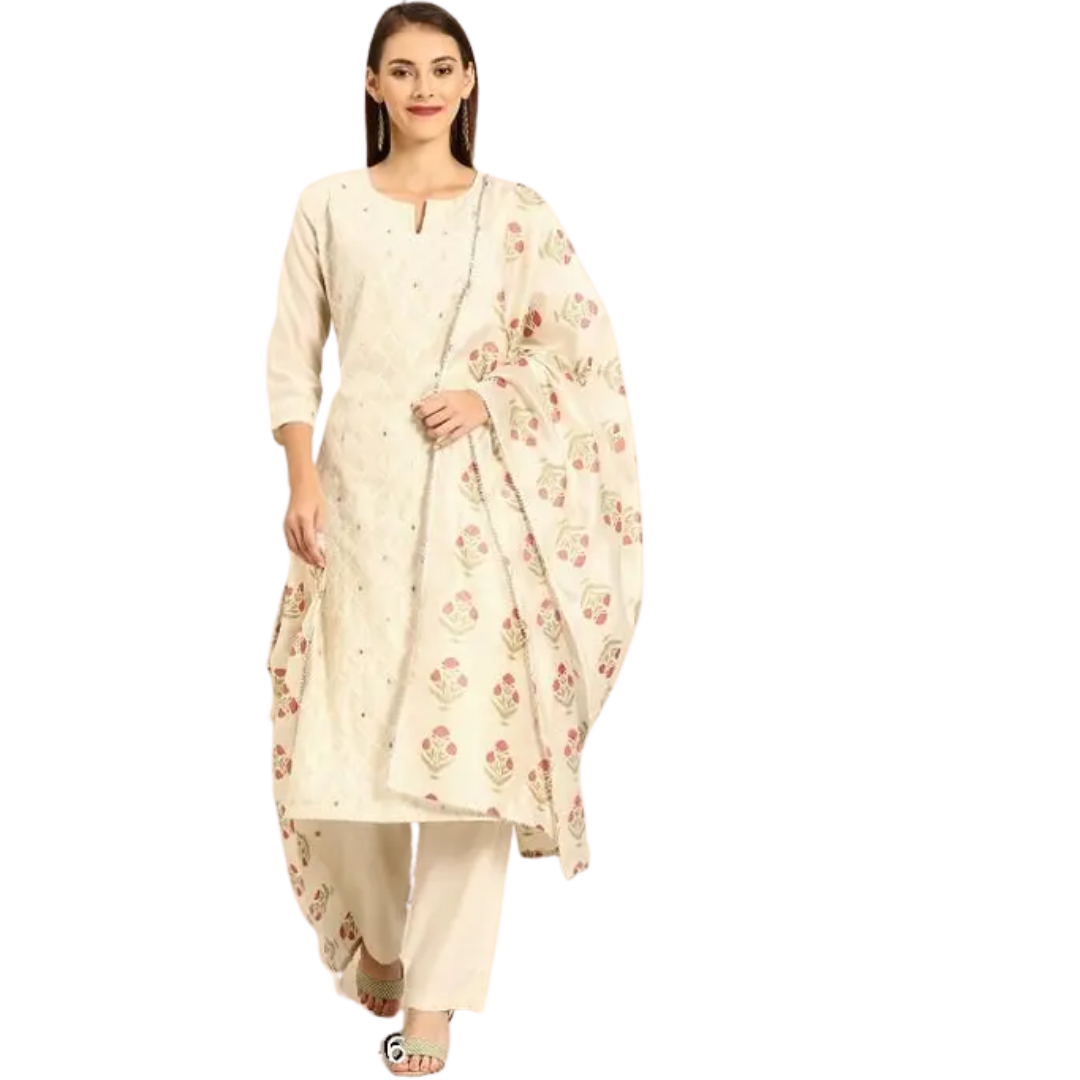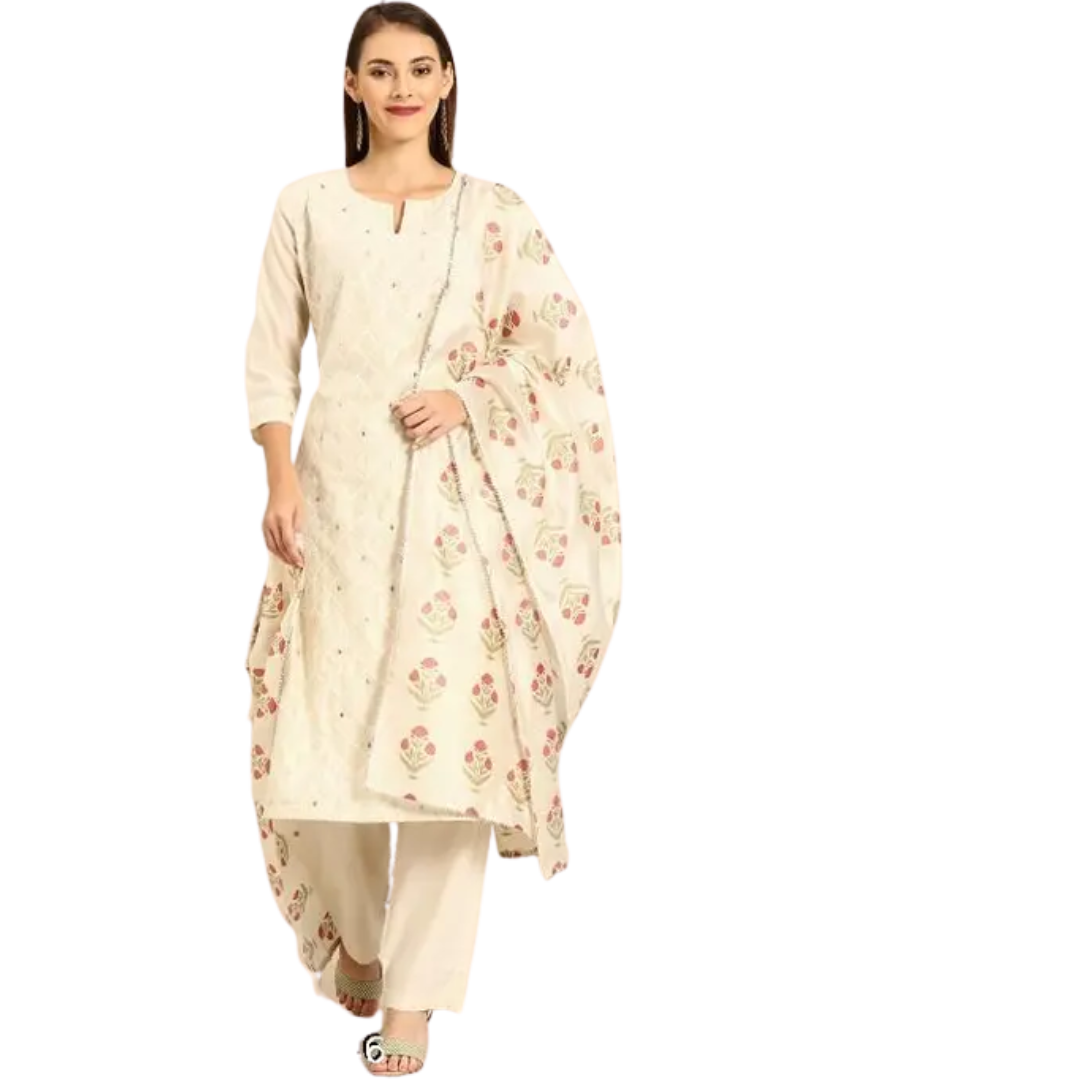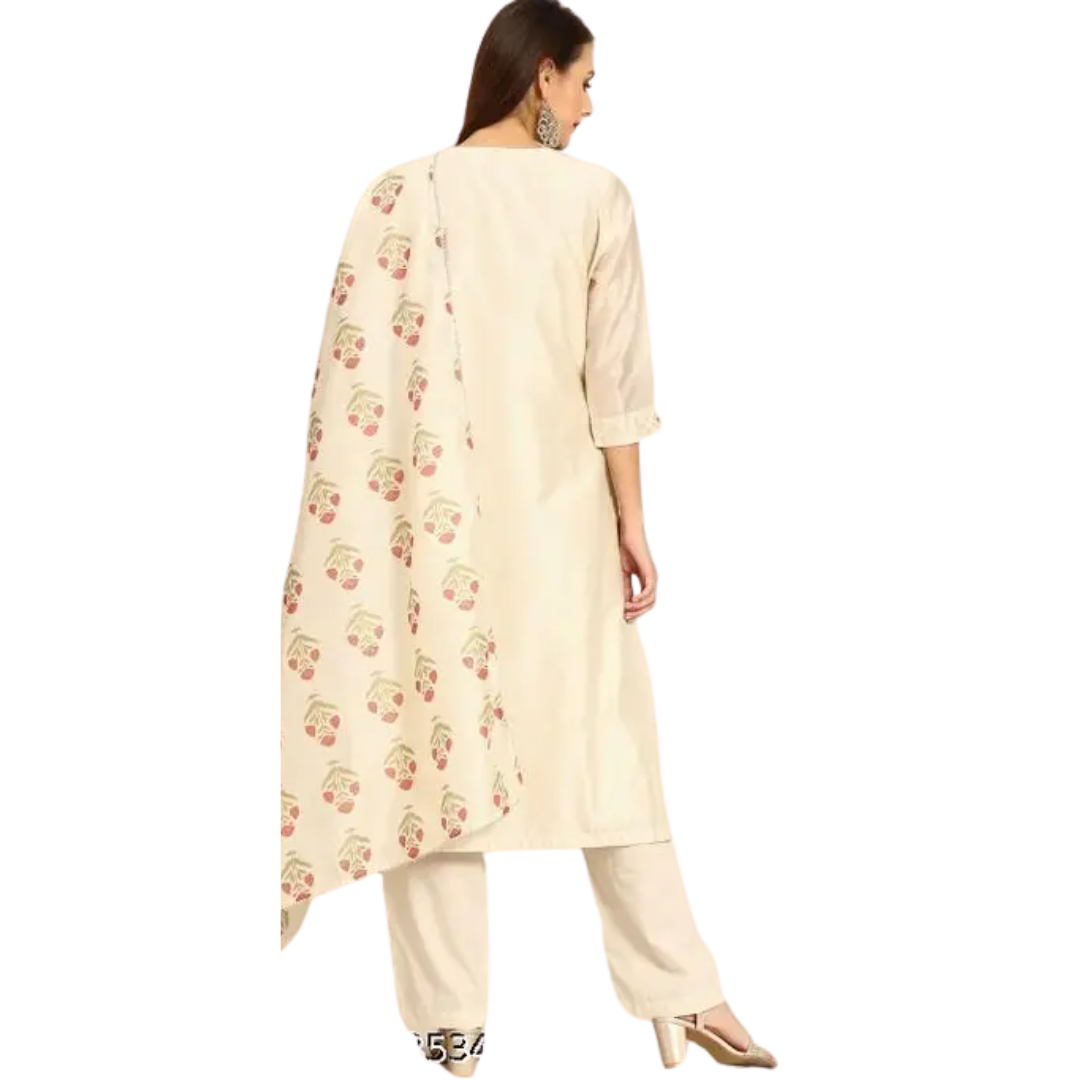 Name : Awesome Women’s Beige Embroidered Kurta With Pant & Dupatta Set